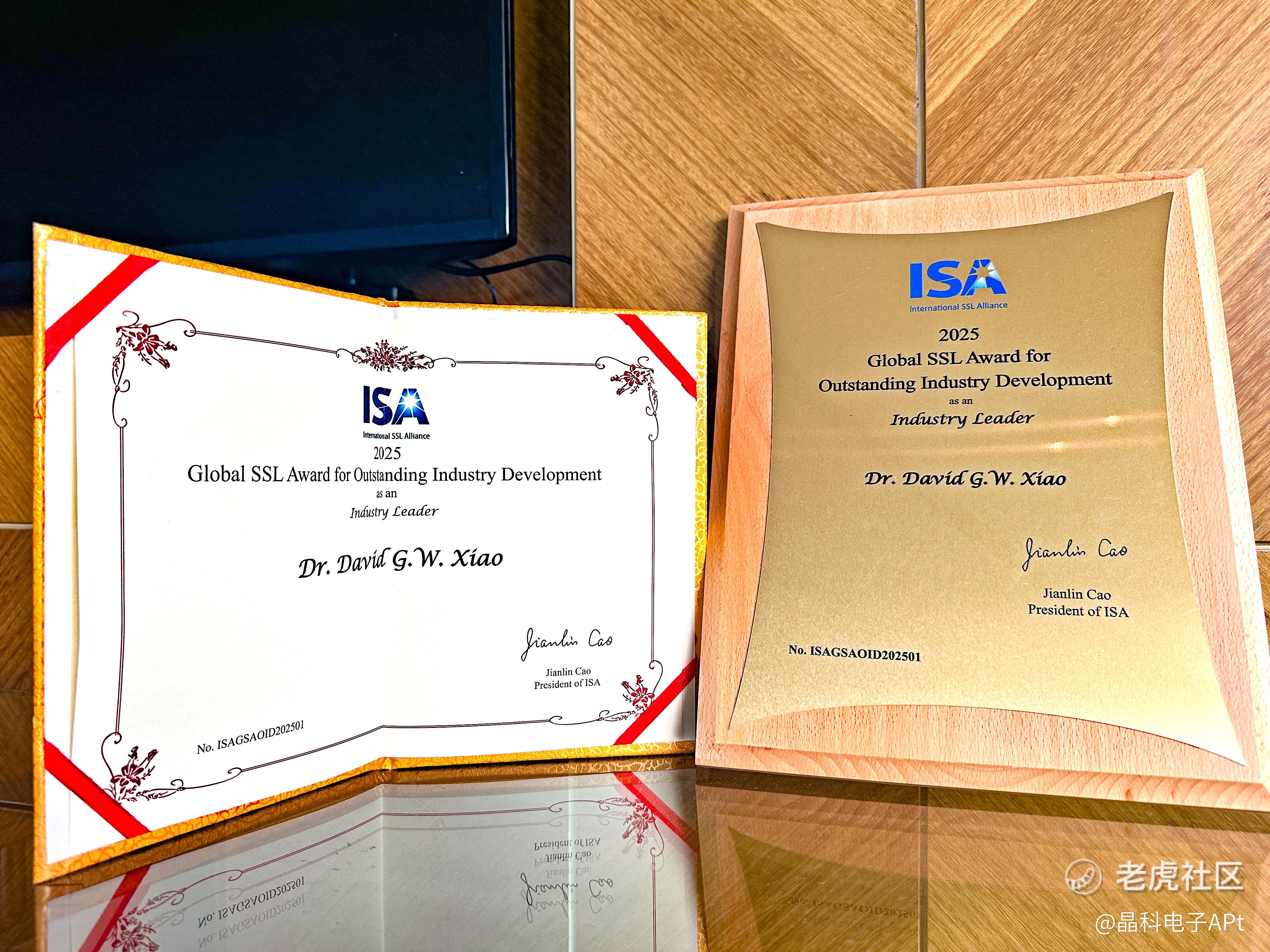 2025年11月13日,在国际半导体照明联盟(ISA)大会上,广东晶科电子股份有限公司(简称“晶科电子”,股票代码:2551.HK)董事长肖国伟博士荣获“全球半导体照明产业发展杰出贡献奖”,以表彰其在第三代半导体领域的技术创新与产业推动方面所作出的突出贡献,特别是在倒装焊LED晶片技术、白光晶片技术及无金线封装技术、碳化矽晶片制造技术以及“LED器件-模组-系统”全产业链整合等方面取得的显著成就。