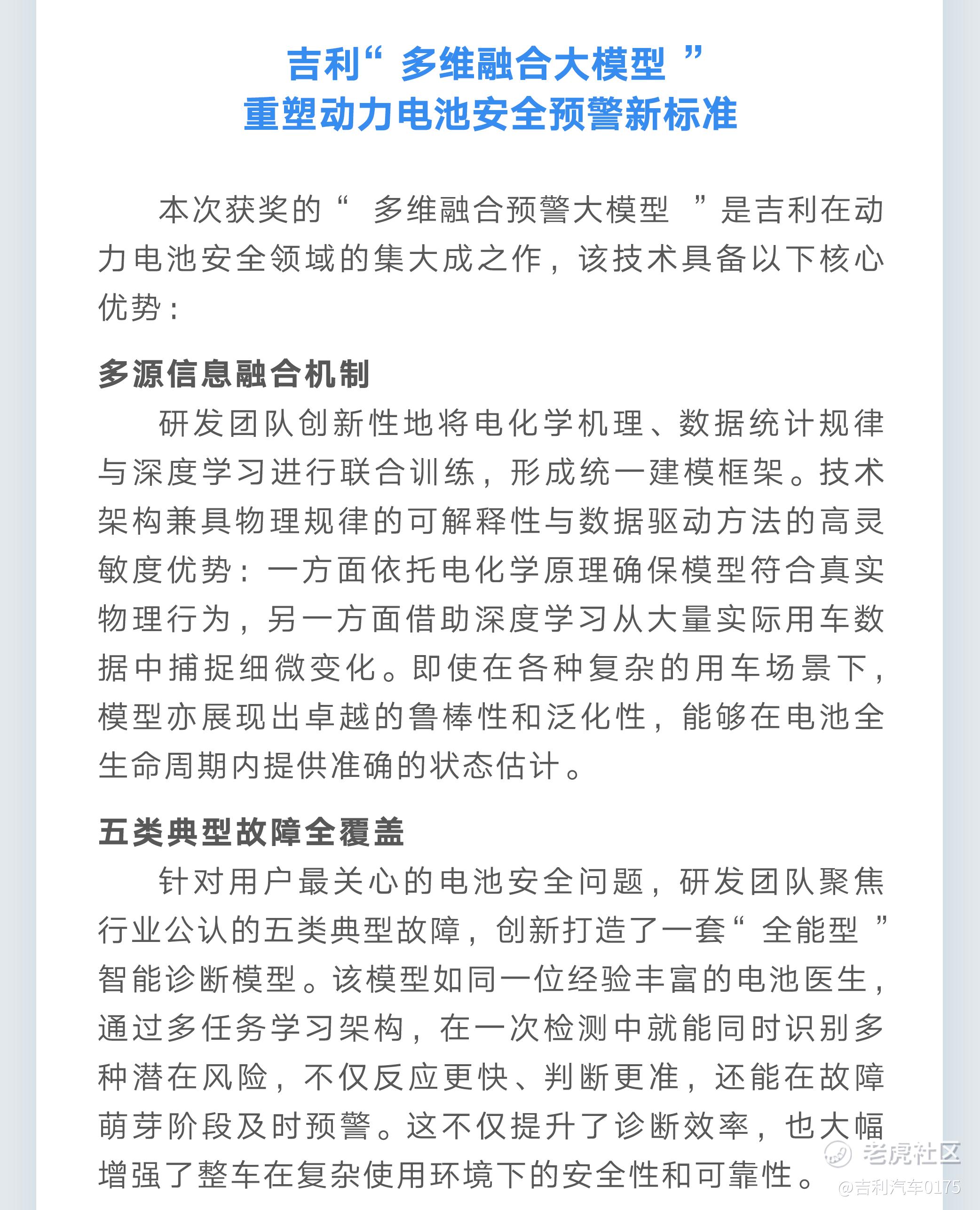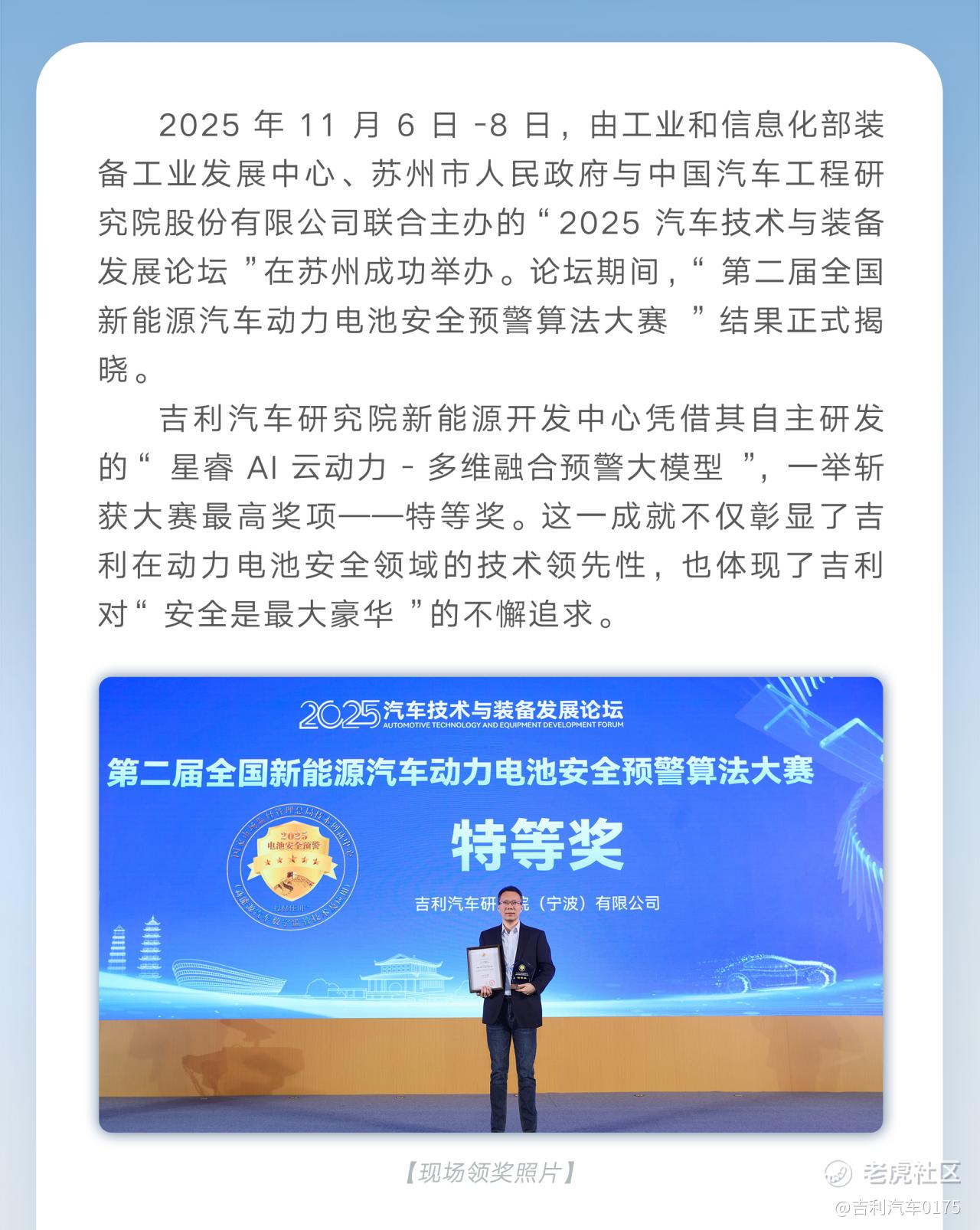 吉利汽车研究院新能源开发中心凭借其自主研发的“星睿AI云动力-多维融合预警大模型”,一举斩获大赛最高奖项特等奖。