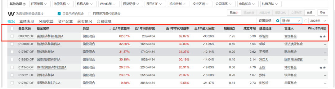 根据Wind,统计全市场名称中带有新材料的主动基金共有9只,截至11月6日,富国新材料新能源近一年、今年来、近三年均排第一。