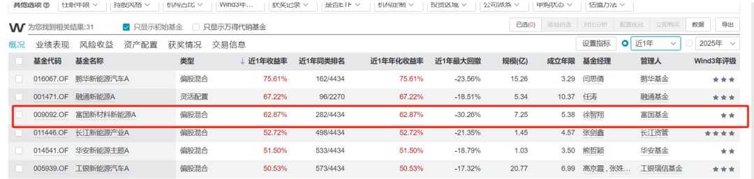 再统计全市场名称中带有新能源的主动基金共有31只,其中富国新材料新能源近一年、今年来、近三年均排在前五。