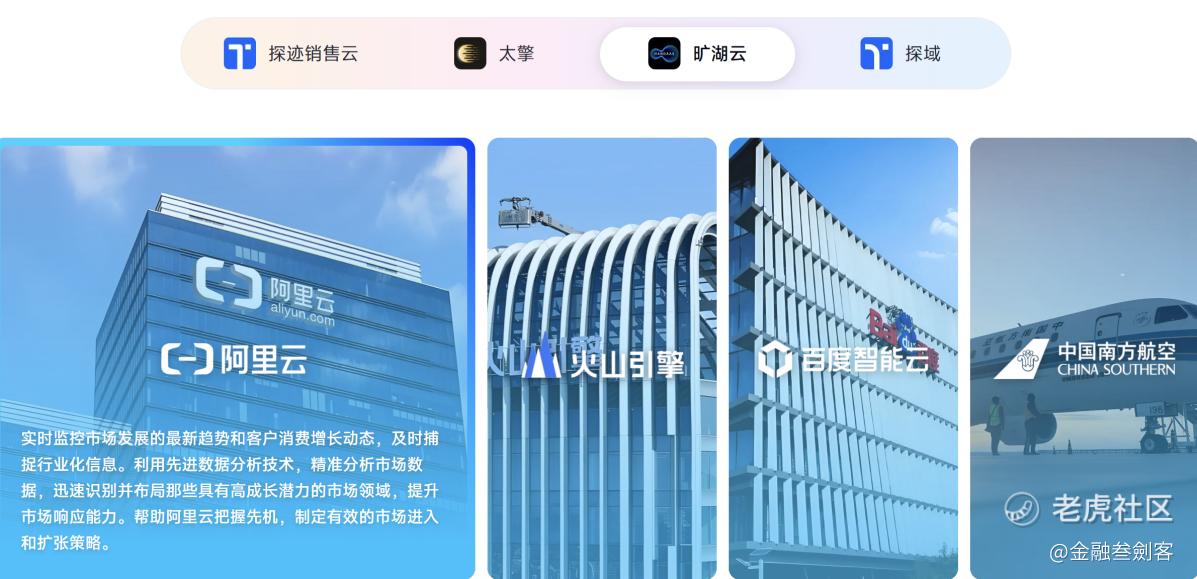 阿里云是探迹的标杆案例:阿里云通过探迹“旷湖”实时监控市场发展的最新趋势和客户消费增长动态,及时捕捉行业化信息。利用先进数据分析技术,精准分析市场数据,迅速识别并布局那些具有高成长潜力的市场领域,提升市场响应能力,“旷湖”帮助阿里云把握先机,制定有效的市场进入和扩张策略。