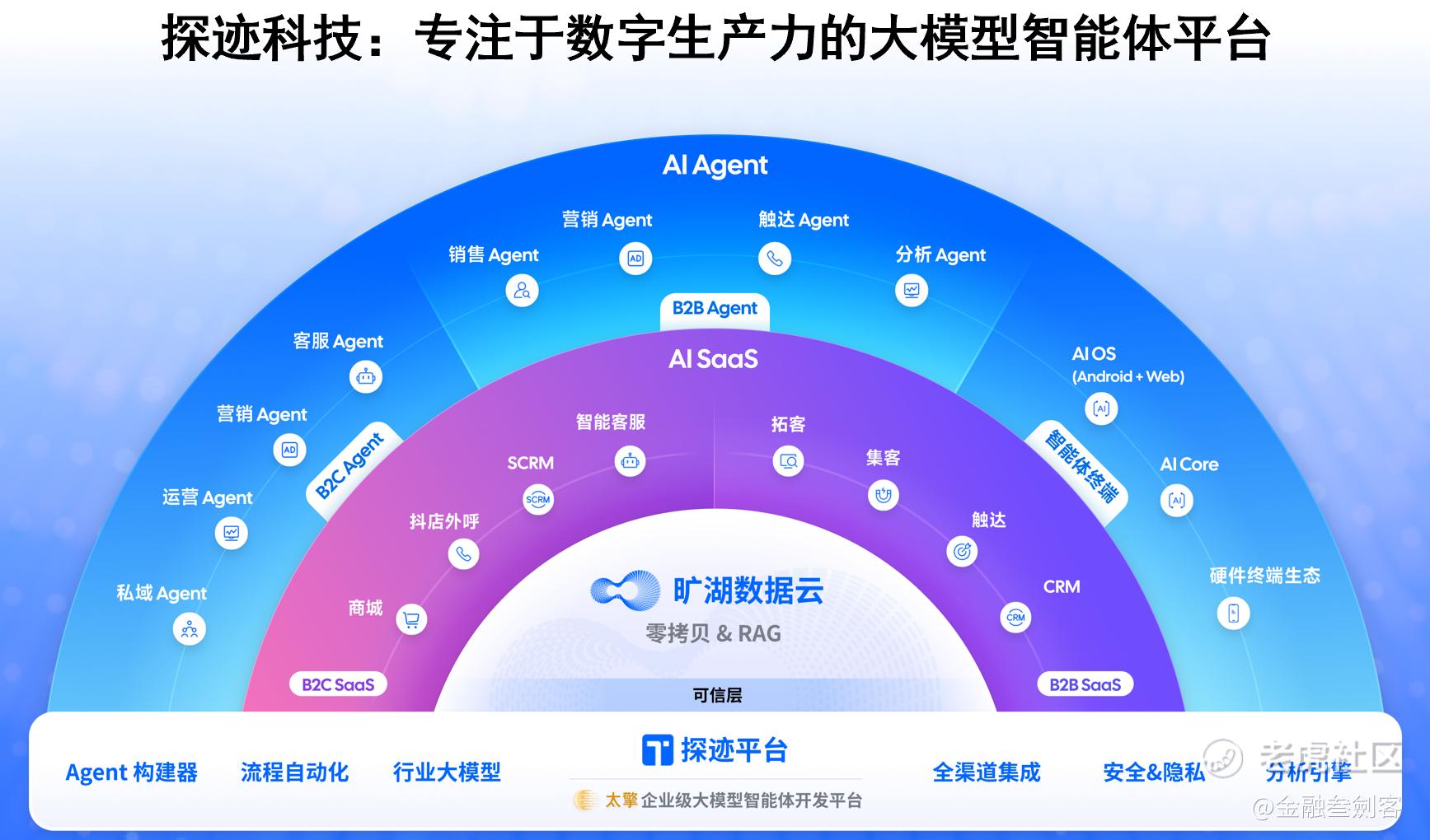 “旷湖”则是探迹科技的大模型智能体数据底座,提供业内领先的数据要素与数据资产管理解决方案。数据云底座汇聚1.8亿企业、3亿+标讯等各类数据资源,为AI提供持续的营养。