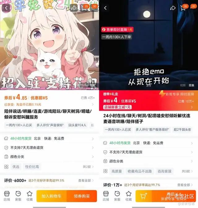 在线上,各类提供情感陪伴的服务悄然兴起。在某语音社交平台上,付费陪聊服务每小时收费50-200元不等,其中“情感疏导”、“树洞倾听”是最受欢迎的项目。在淘宝网上,陪伴说话/哄睡/聊天等产品多种多样,排名靠前的商家已经售出数万单,获得了10000+的评价。