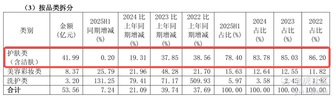 2025年上半年,珀莱雅护肤类(含洁肤)实现营收41.99亿元,同比仅微增0.2%,占总营收比重降至78.40%。