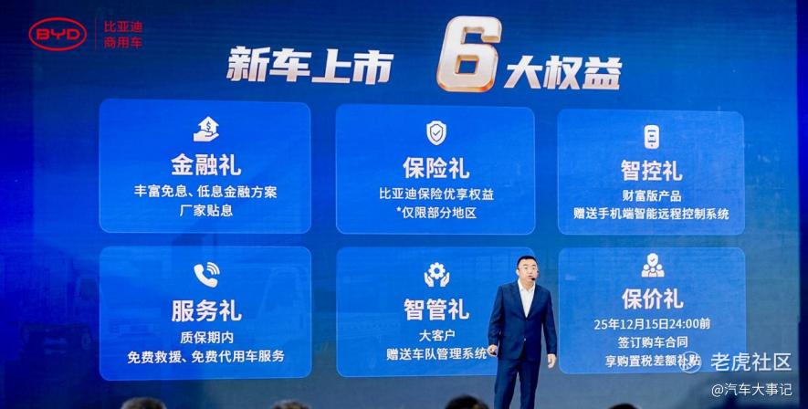 为赋能物流用户,比亚迪同步推出 6 大上市权益涵盖免息金融、保险优享、免费赠送智能远程控制系统、质保期免费救援和代用车服务、大客户专属车队管理系统及购置税报价补贴,覆盖购车到运营全周期,助力低成本高效创富。同时,三电系统10年/80万公里超长质保,为物流用户打造低成本高效创富方案,推动行业绿色智能升级。