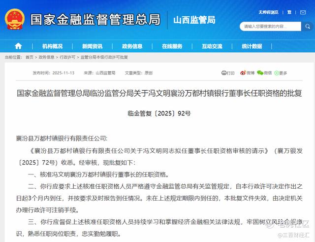 2025年以来,山西金融机构多个任职资格获批,包括山阴农商银行董事及董事长、大同农村商业银行股份有限公司行长、山西宁武农村商业银行行长、山西方山农村商业银行股份有限公司董事长、山西金融租赁有限公司董事长等。