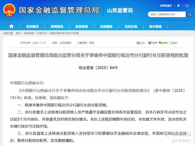 11月13日,国家金融监督管理总局临汾监管分局发布了三则人事批复。
