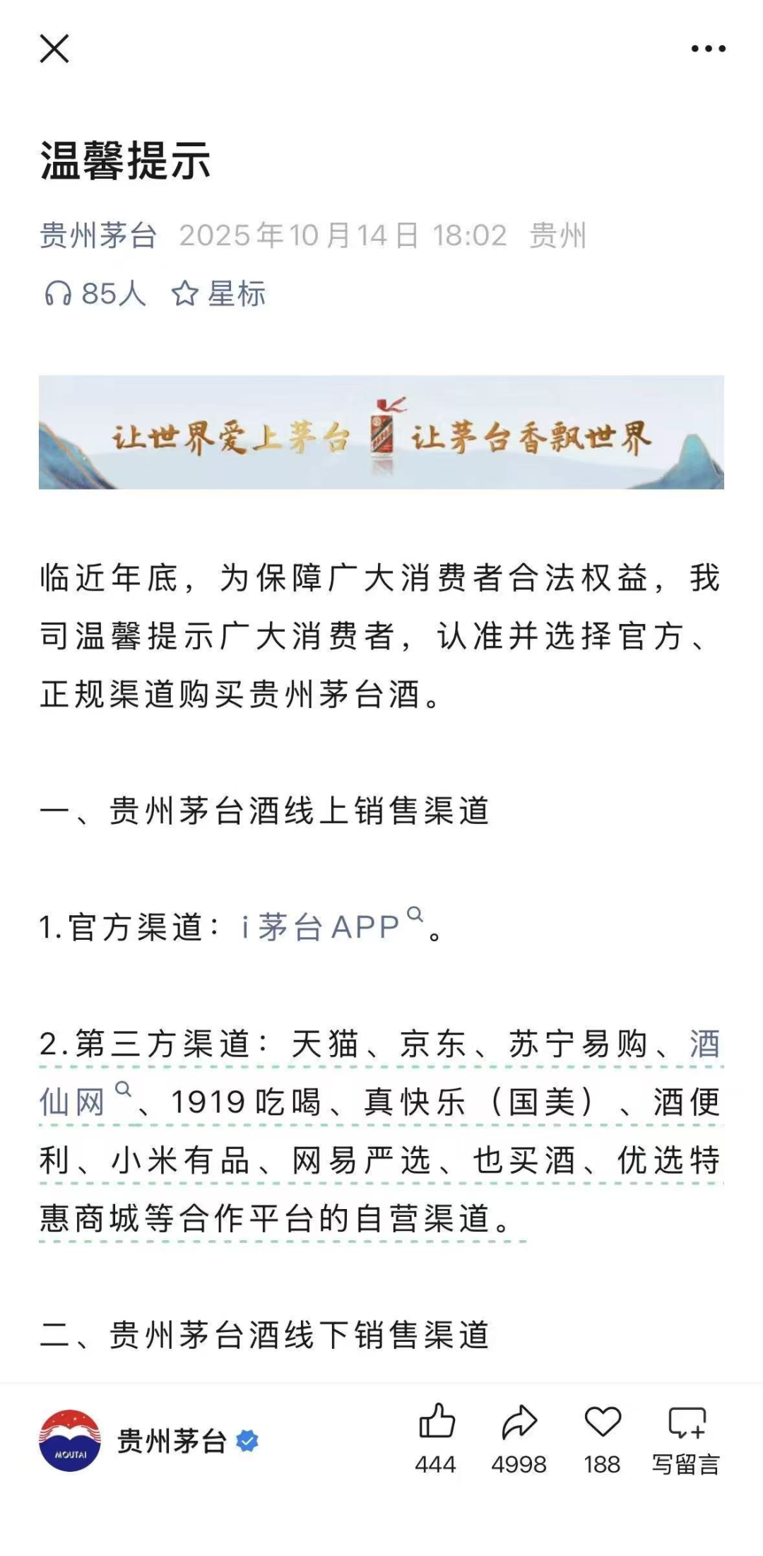 10月中旬,茅台曾提示广大消费者,认准并选择官方、正规渠道购买贵州茅台酒,并发布天猫、京东、苏宁易购、酒仙网、1919吃喝、真快乐(国美)、酒便利、小米有品、网易严选、优选特惠商城等多家合作平台的正规自营渠道。