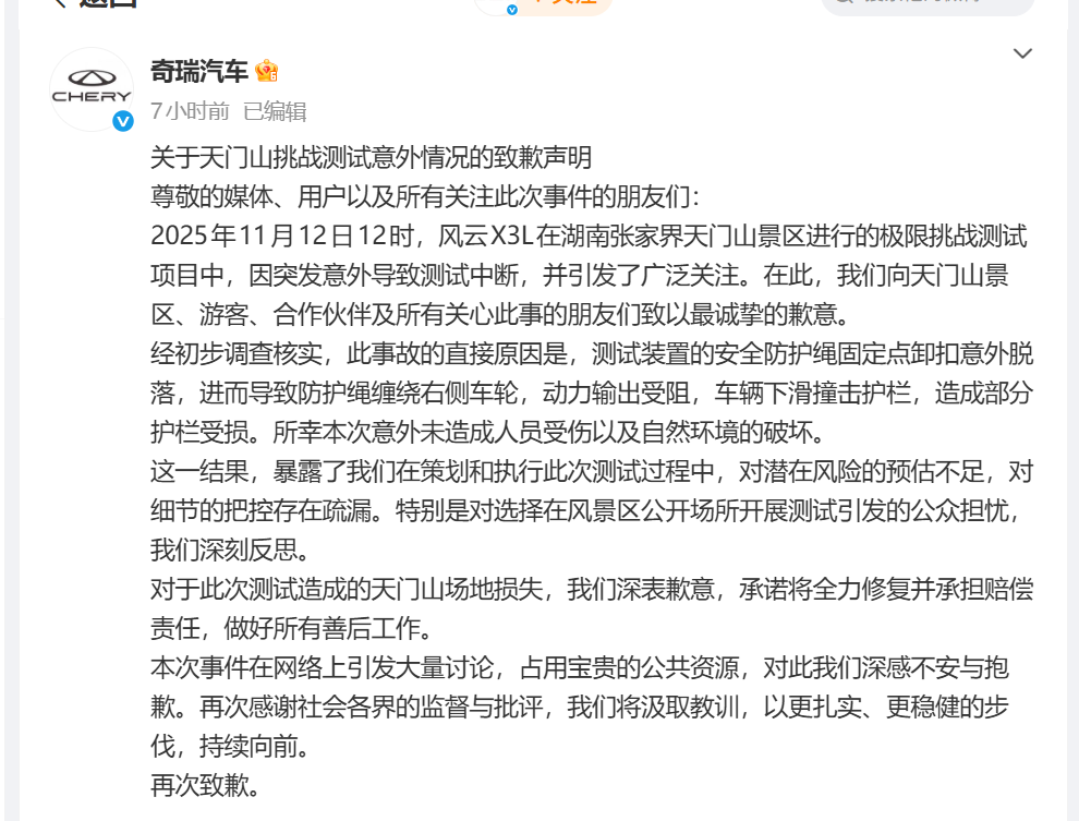 从企业社会责任角度,在自然保护区或风景名胜区进行高风险测试是否恰当,值得深思。虽然奇瑞声明本次意外“未造成自然环境的破坏”,但车辆溜车撞击护栏的事故,已对景区设施造成实质性损害。