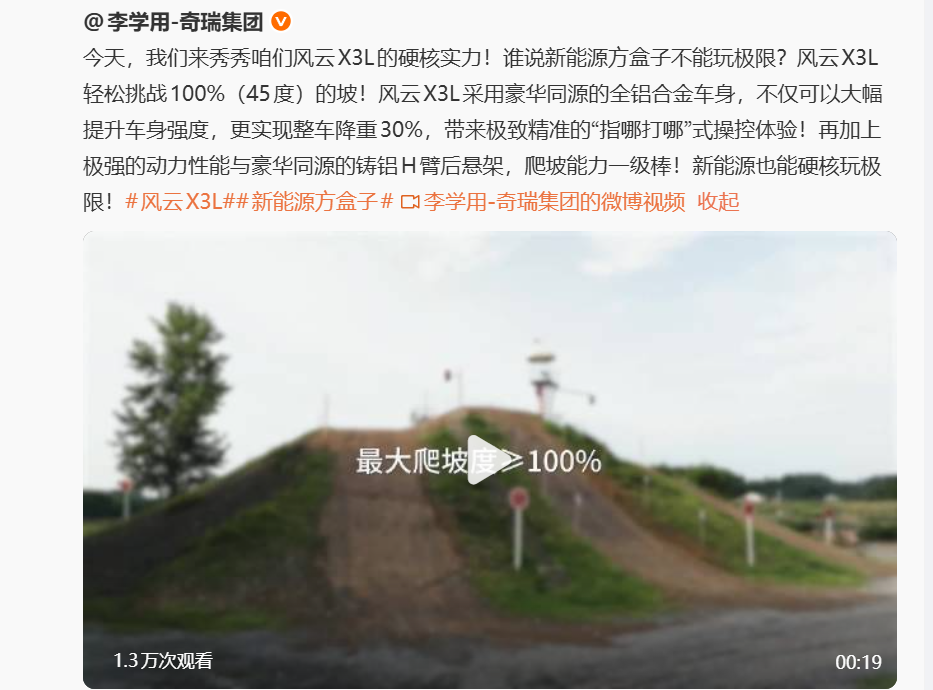 风云X3L是奇瑞汽车面向年轻消费者推出的一款“高颜值方盒子”车型,主打10万级市场。在此次事件发生前,奇瑞汽车执行副总裁李学用曾在社交媒体高调预热,称“风云X3L已经“成功攀爬超半程,状态稳定非常好。”