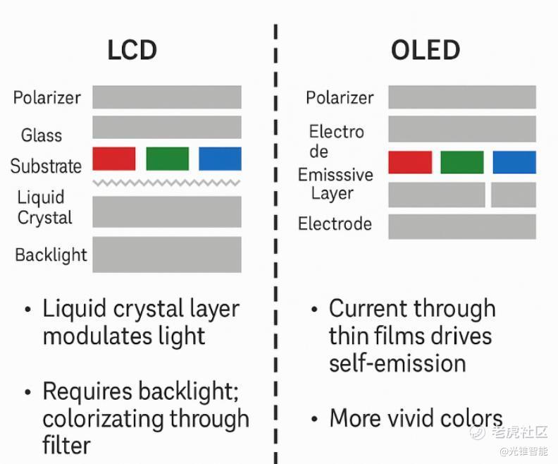 回顾LCD之后的显示技术迭代,其核心解决的问题都一样——就是把之前的背板发光方案,换成控制每个像素自发光。