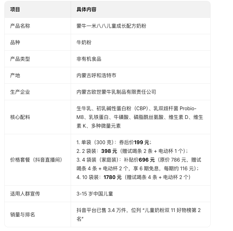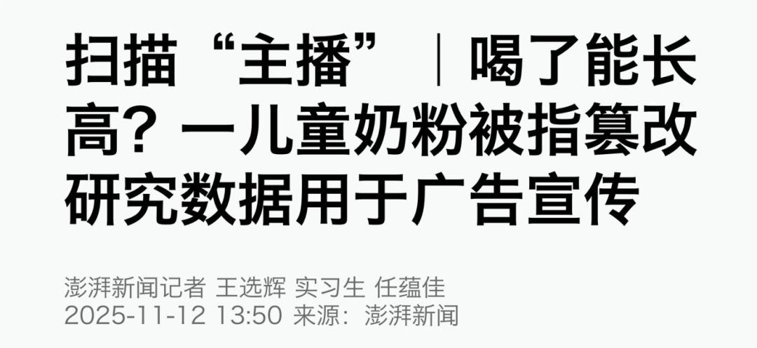 2025 年 11 月,消费者向澎湃新闻投诉,蒙牛一米八八儿童奶粉在直播间销售及产品宣传中,存在不科学宣称 “能长高”、篡改研究数据等行为,涉嫌违反《广告法》。澎湃新闻通过跟踪直播间、核查研究报告、采访相关单位,证实了上述问题。