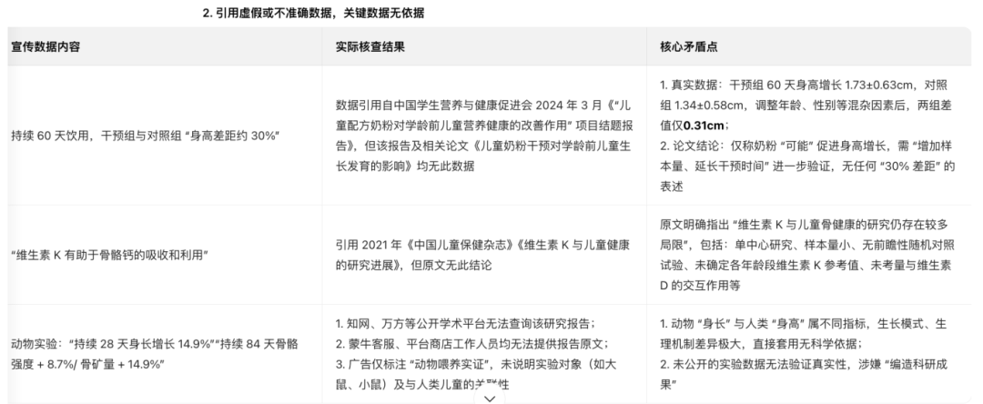 2 、篡改研究数据,虚假宣称 “持续 60 天饮用后干预组与对照组身高差距约 30%”,但合作研究单位中国学生营养与健康促进会证实报告无此数据,实际两组调整后身高差值仅 0.31cm;