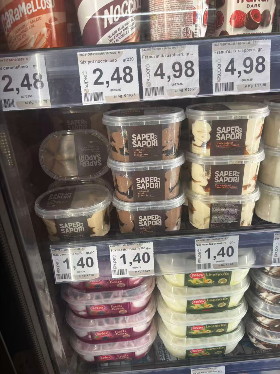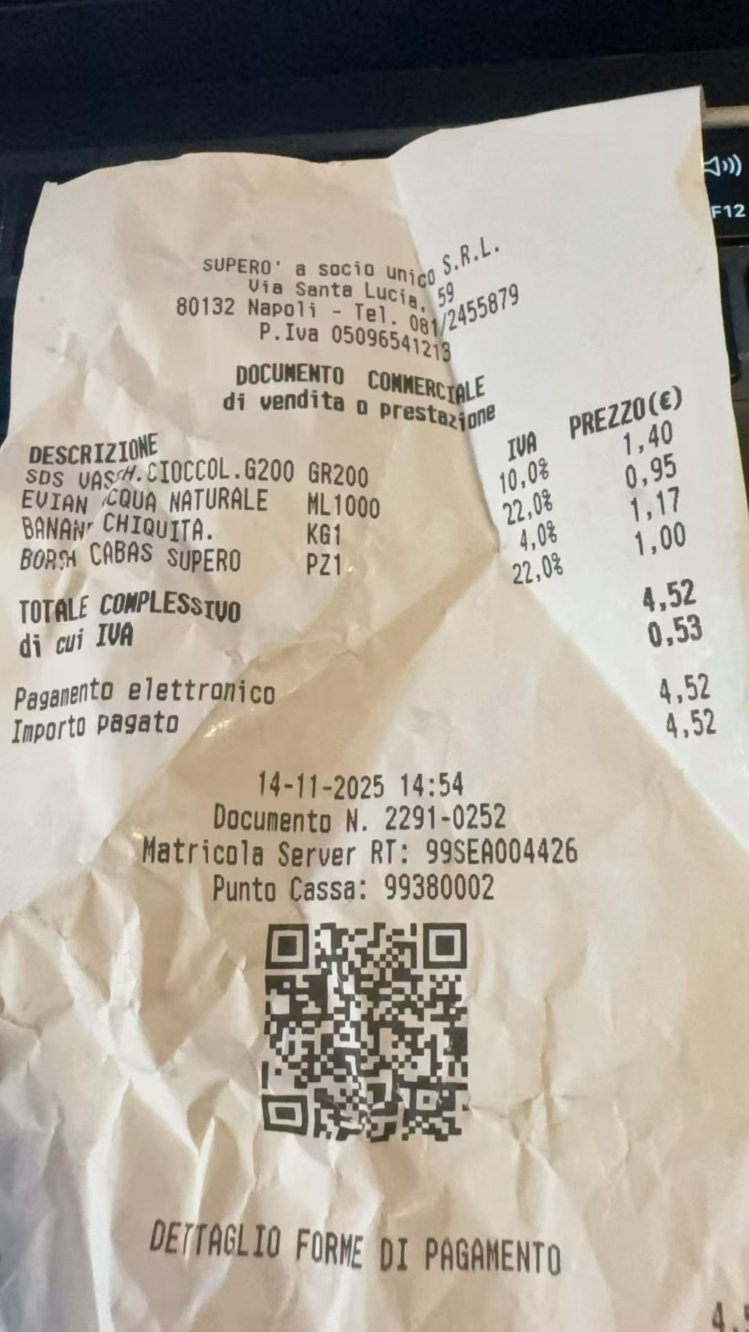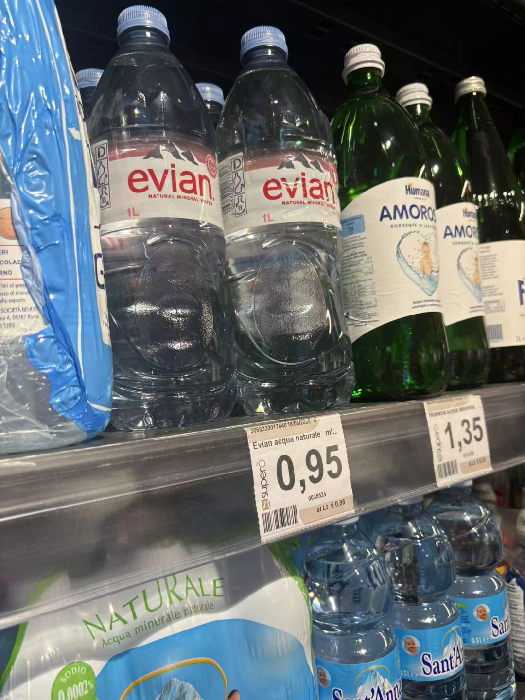 在意大利那不勒斯考察了这个欧洲国家的物价,感觉比英国便宜不少,更比美国便宜多了。 买了一个 evian 矿泉水,4 个香蕉,一盒冰淇淋,移动 3.82 欧,加上一个好看的口袋,一共 4.82.