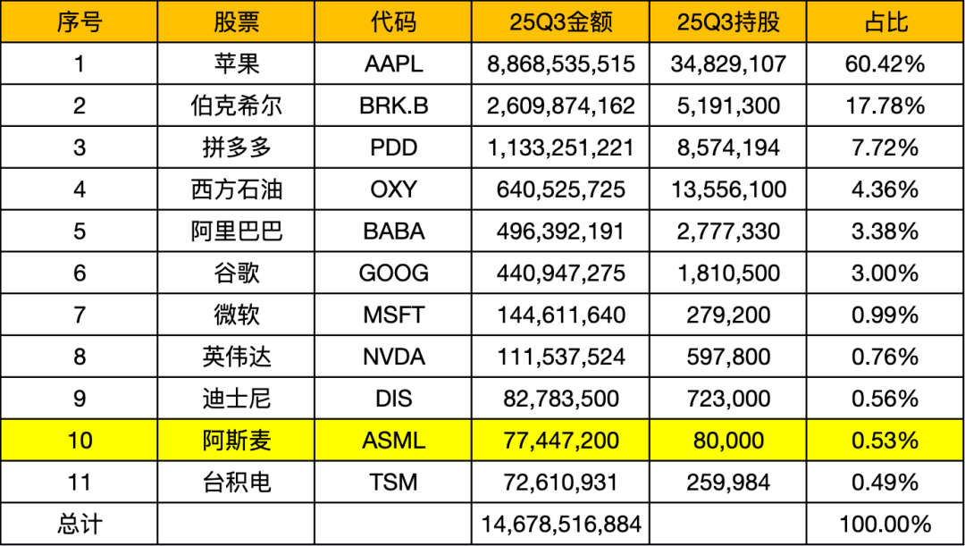 大道美股2025Q3共持有11只股票,2025Q2美股持有10只股票,Q3新建仓了阿斯麦一只股票。