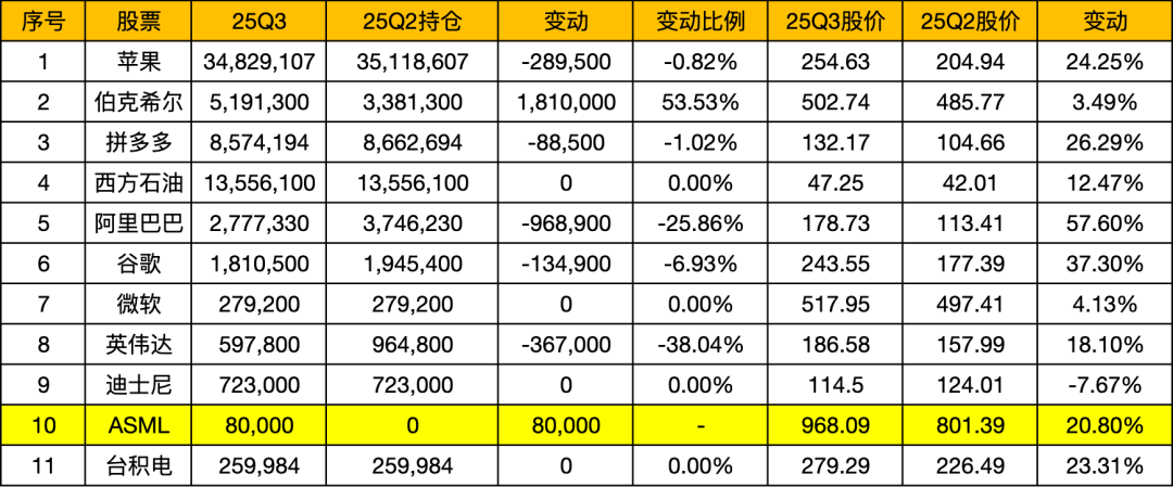 段永平2025Q3持仓和变动明细-新建仓阿斯麦,大幅加仓伯克希尔。