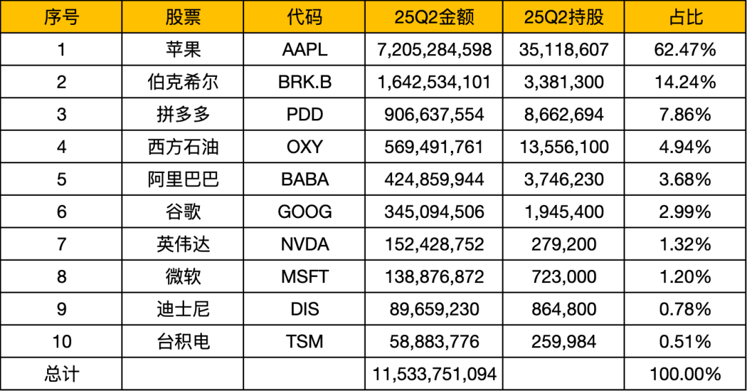 2025Q3大道美股按持仓金额排序,前六大持仓没有发生变化,依旧是苹果、伯克希尔、拼多多、西方石油、阿里巴巴、谷歌;持仓金额分别为88.7亿美金、26.1亿美金、11.3亿美金、6.4亿美金、5.0亿美金、4.4亿美金。