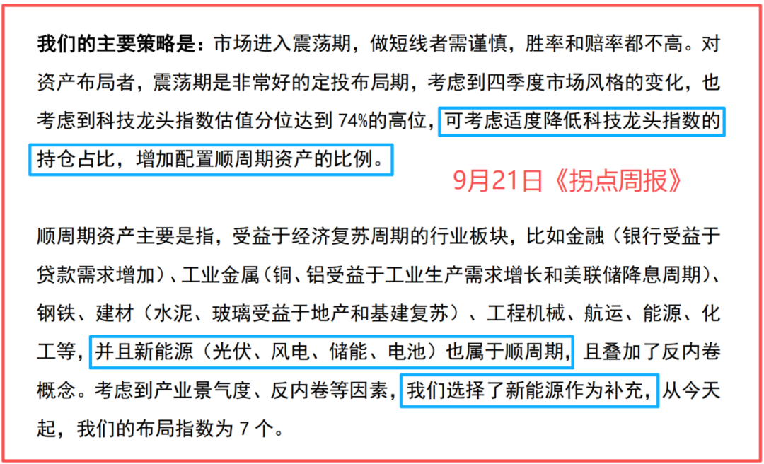 图:9月21日《拐点周报》提示减科技龙头,补新能源