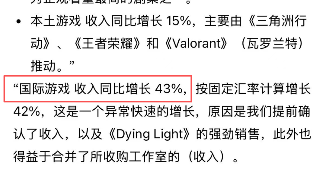 腾讯这轮海外收入的增长,主要是收购的工作室共享的,即使大名鼎鼎的消光,网易在海外也收购了一大堆,但是好像形成收益的并没有多少。买了底特律变人,然后迟迟也没看到他们的新作,蛮可惜的。虽然两家对被受过企业的干预都很少,但是投后管理者个事 ,是一个门很大的学问,山头主义放羊式投后管理和资源式投后管理,还是有很大区别的。