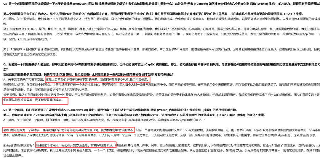 在整个电话会议里的QA环节,被问及最多的问题,就是腾讯的AI,接近一半的问题是跟Ai相关,核心原因是与阿里相比,腾讯的capex太低了,说白了就是没花太多钱建数据中心和买卡,投资人担心腾讯会在AI打战里落后,毕竟这个时代是投资性先行。