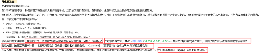 不过我们今天的重点,并不是对季报本身进行点评,而是要跟大家聊一聊季报后由马化腾亲自参与25Q3业绩电话会,我会尽量放电话会议原文,从中分享一些我个人对腾讯的认知。PS:利益相关,我有接近30%仓位的腾讯。