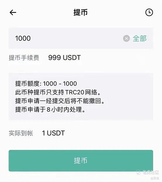 JPEX 用户截图,USDT 提现手续费飙升至 999 USDT(最高提现限额 1000 USDT)