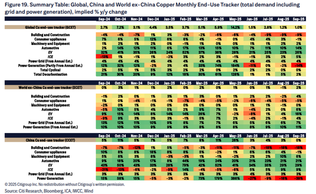 铜的第二个扭曲,来自需求端,铜的需求中,今年有很明显的结构性差异,也就是之前说过的,周期行业其实很差,铜的终端需求里面,房地产,家电,电网,前两个都是明显的强周期行业,而且是同一个周期。今年表现其实都一般。今年铜需求比较不错的是电动车和汽车。尤其是中国的电动车