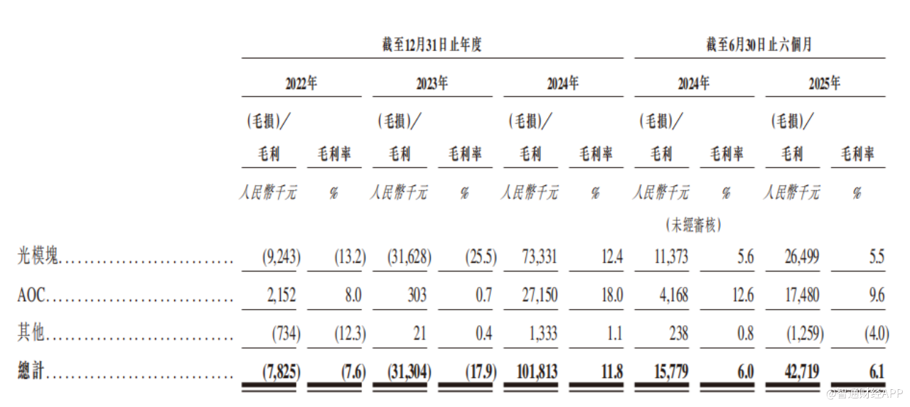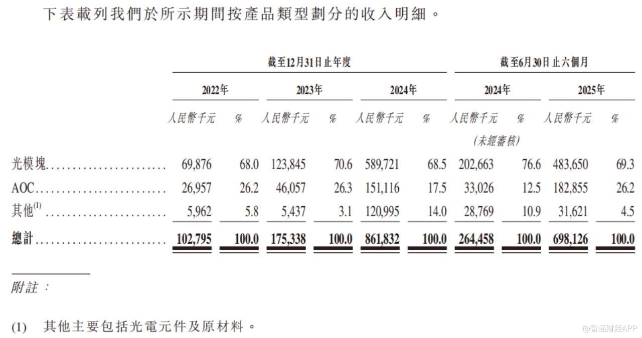 产品收入结构上,光模块为公司核心收入来源,2022-2024年及2025年上半年收入占比分别为68%、70.6%、68.5%及69.3%;AOC产品占比在12.5%-26.3%之间波动,2025年上半年达26.2%;其他产品(主要包括光电元件及原材料)占比相对较小,2025年上半年为4.5%。