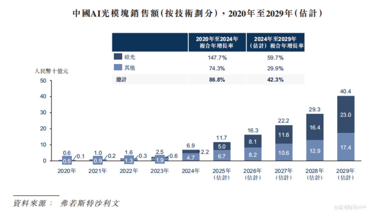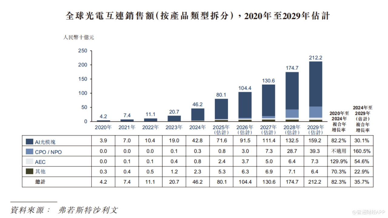 根据弗若斯特沙利文数据,全球光电互连市场销售额已由2020年的42亿元增长至2024年的462亿元,复合年增长率达82.3%,预计2029年将进一步增长至2122亿元,2024-2029年复合年增长率为35.7%。其中,AI光模块作为核心细分领域,2020-2024年复合年增长率达82.2%,2024年市场规模达428亿元,预计2029年将增至1592亿元,复合年增长率30.1%。