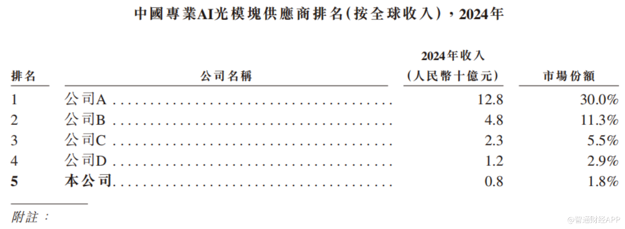 据弗若斯特沙利文数据,按2024年收入计,海光芯正以0.7%的市场份额在全球专业光模块提供商中排名第十,且为2022-2024年前十大厂商中收入增长最快的企业。在全球及中国专业AI光模块提供商中分别排名第六及第五,占全球市场份额1.8%。