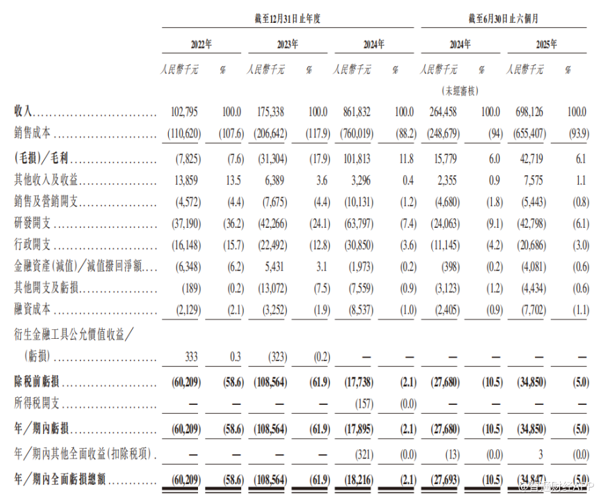 受益于AI数据中心对光模块的强劲需求及公司产品竞争力的提升,海光芯正近年来收入实现高速增长。财务数据显示,2022年、2023年、2024年及2025年上半年,公司营业收入分别为1.03亿元(人民币,下同)、1.75亿元、8.62亿元及6.98亿元。其中,2022-2024年营收复合年增长率为189.6%,2025年上半年营收同比增长164.4%。