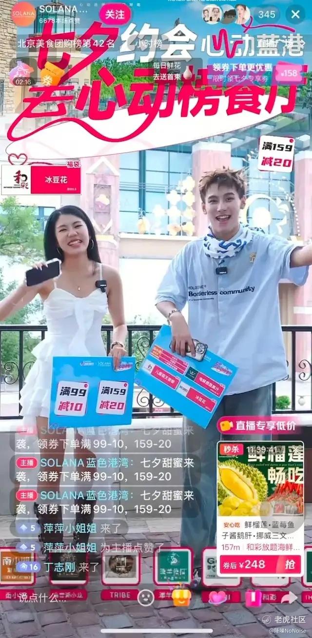 蓝色港湾联合抖音,结合热门IP「星光音乐会」落地七夕主题活动。郑哲伦称,现场节日浪漫氛围拉满,带动当日客流提升超两成。合生汇联合抖音,会同B1、B2层的「21街区」拉面、炸串、盖浇饭等200余家店铺,推出「七夕约会去合生汇」主题活动,把分散的消费场景重新组合成一个「节日事件」,再通过直播一站式发券,转化率直线上升。