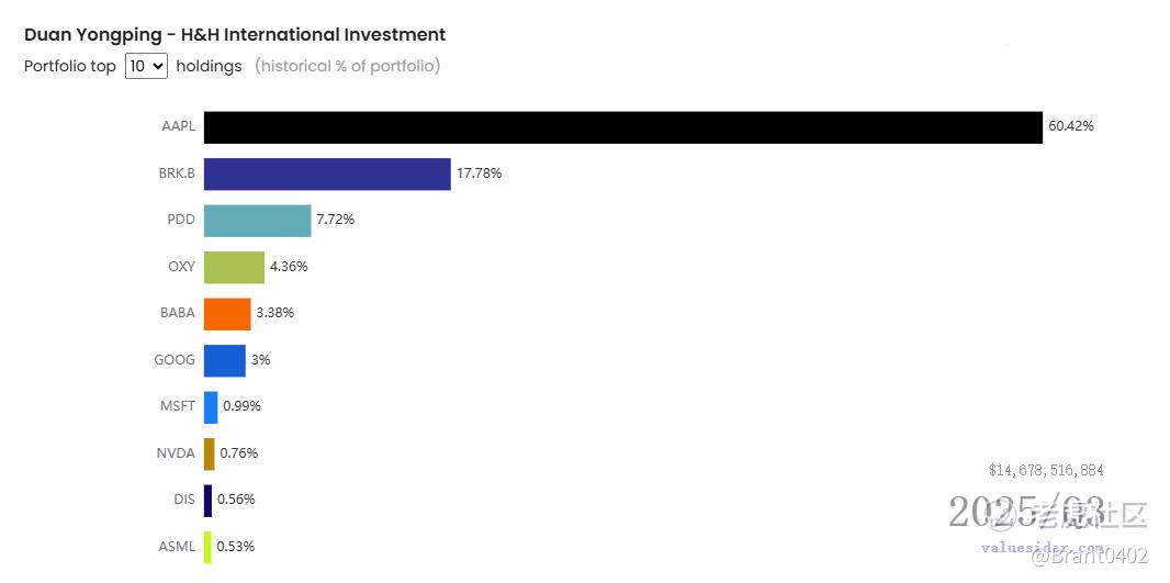 根据最新披露的2025年第三季度SEC 13F文件,段永平旗下的H&H International Investment持仓规模达到146.8 亿美元,共持有11只美股资产。整体投资风格持续保持高集中度,其中前五大持仓合计占比超过93%,充分体现了段永平典型的“极度集中投资”风格。