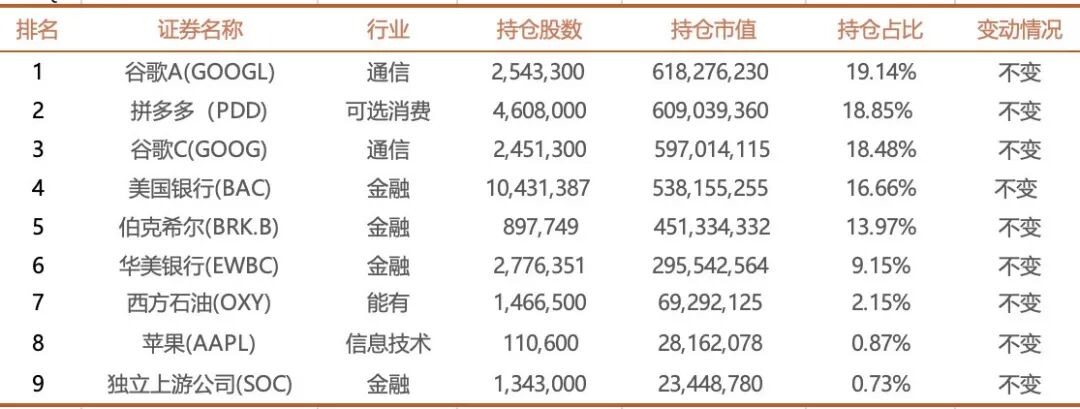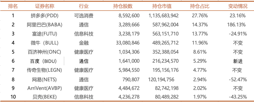 中概股部分,网易仍位列第二,但被小幅减持7.8%;拼多多持仓微幅增加4.3%,重回第四;阿里巴巴则在连续两个季度减仓后明显回补,单季增幅超过80%。