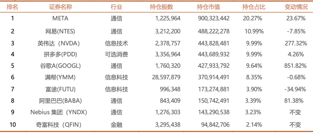 Meta继续稳居第一大重仓股,持仓市值超过9亿美元,占比20%,与第二名网易仍保持9个百分点以上差距。