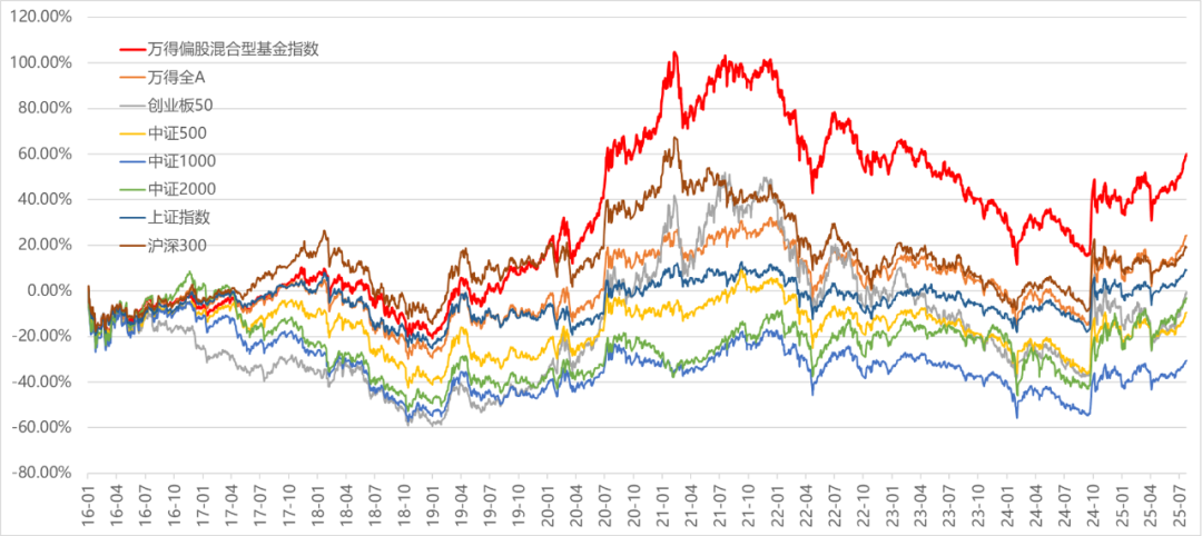 如果自身目标只是跑赢沪深300或者中证A500之类的宽基指数,选择相应的指数增强产品,大概率可以满足目标。但是如果投资主动权益基金,所谓“平均”水平,目前使用较多的是Wind偏股混合基金指数(885001),这是Wind根据市场上所有成立时间超过3个月的偏股混合型基金等权编制的,大体上反映国内偏股混合型基金的整体表现。