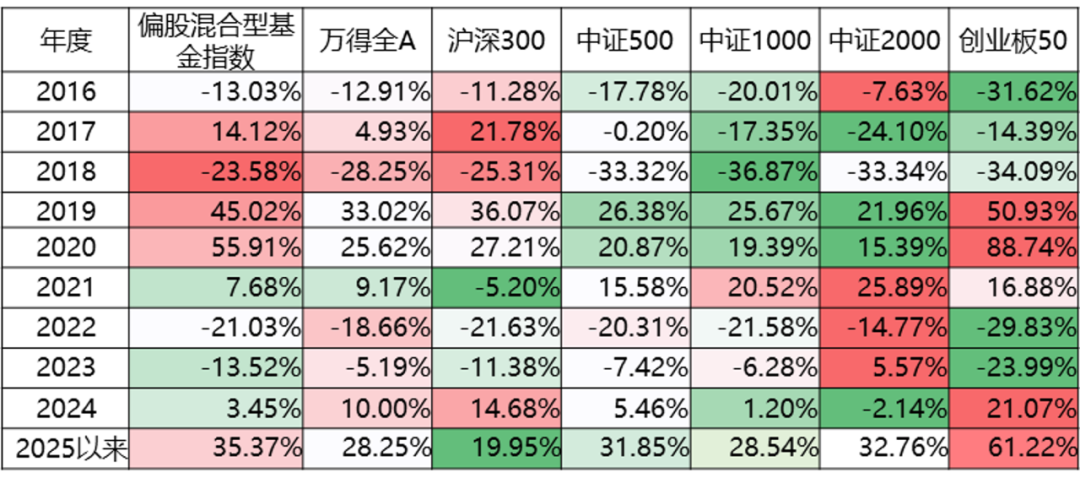 从单一年度来看,虽然过去两年大家体感很明显,似乎主动权益类产品“不行”了,但是在今年以来,或者在过去的几年,偏股混合型基金指数的表现还是比较不错的。
