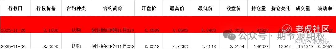 (3)创业板ETF期权:11月最大持仓范围3000-3200,今收3.084,下跌0.29%。期权11月主力合约,认购和认沽都是低行权价增仓高行权价减仓。认购增仓集中在2950-3300,合计5.2W张,3400以上都减仓,但量较少,合计不到1W张;认沽增仓集中2700-3100,合计2.6W张,减仓较小可忽略不计。市场对认购和认沽都有分歧,分歧的行权价都在往下移,市场比较悲观。变化超过1W张的仓位如下,红色是增仓较大的。