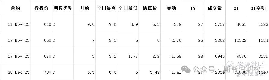 (4)宁德时代:11月最大持仓范围520-550,今收526.0,下跌2.95%。期权盘路,26年3月640购增仓1000张,其他没有什么特别的。