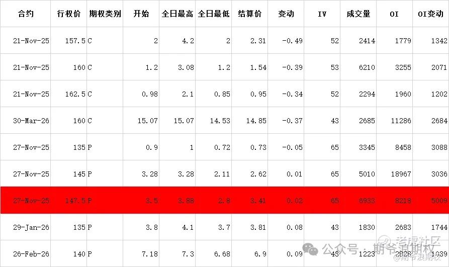 (2)阿里:11月最大持仓范围145-220,窝轮牛熊街货分布150-185,今收154.9,不涨不跌。期权盘路变化超过1000张的仓位如下,粉红色是增仓较大的。今天的大佬们还是以避险为主,最低看到135。