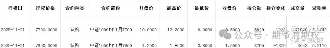 (4)中证1000期权:11月最大持仓范围7000-7600,今收7523.08,上涨0.27%。期权11月主力合约,认购增仓集中在7500-7700,合计1600张,减仓集中在7800-8000,合计2300张;认沽几乎全是减仓,集中在6300-7000,合计4000张。比起以上三个ETF,中证1000比较抗跌,但即使这样,今天的市场也偏悲观。变化超过1000张的仓位如下: