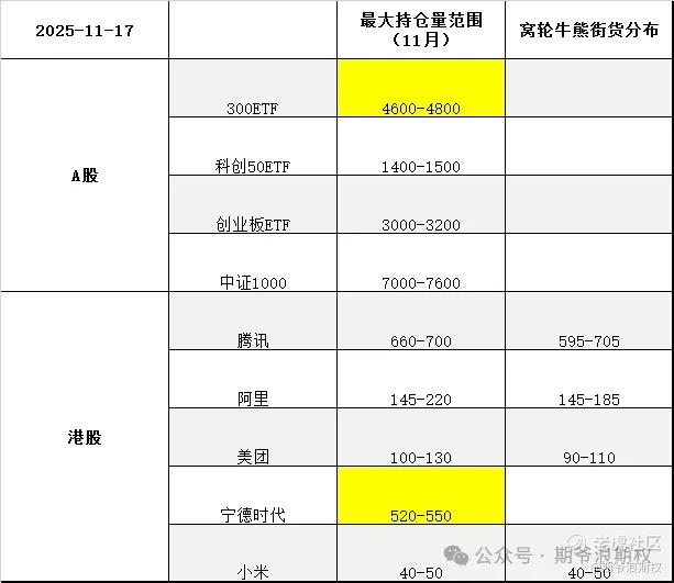 下图是今天大A的3个ETF和中证1000,以及港股的腾讯、阿里、美团、宁德和小米的最大持仓量范围以及窝轮牛熊分布范围,也就是11月的期权筹码分布,黄色的表示跟上个交易日有变动。