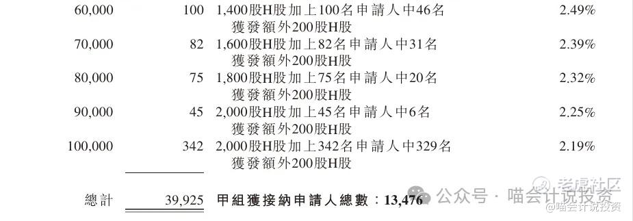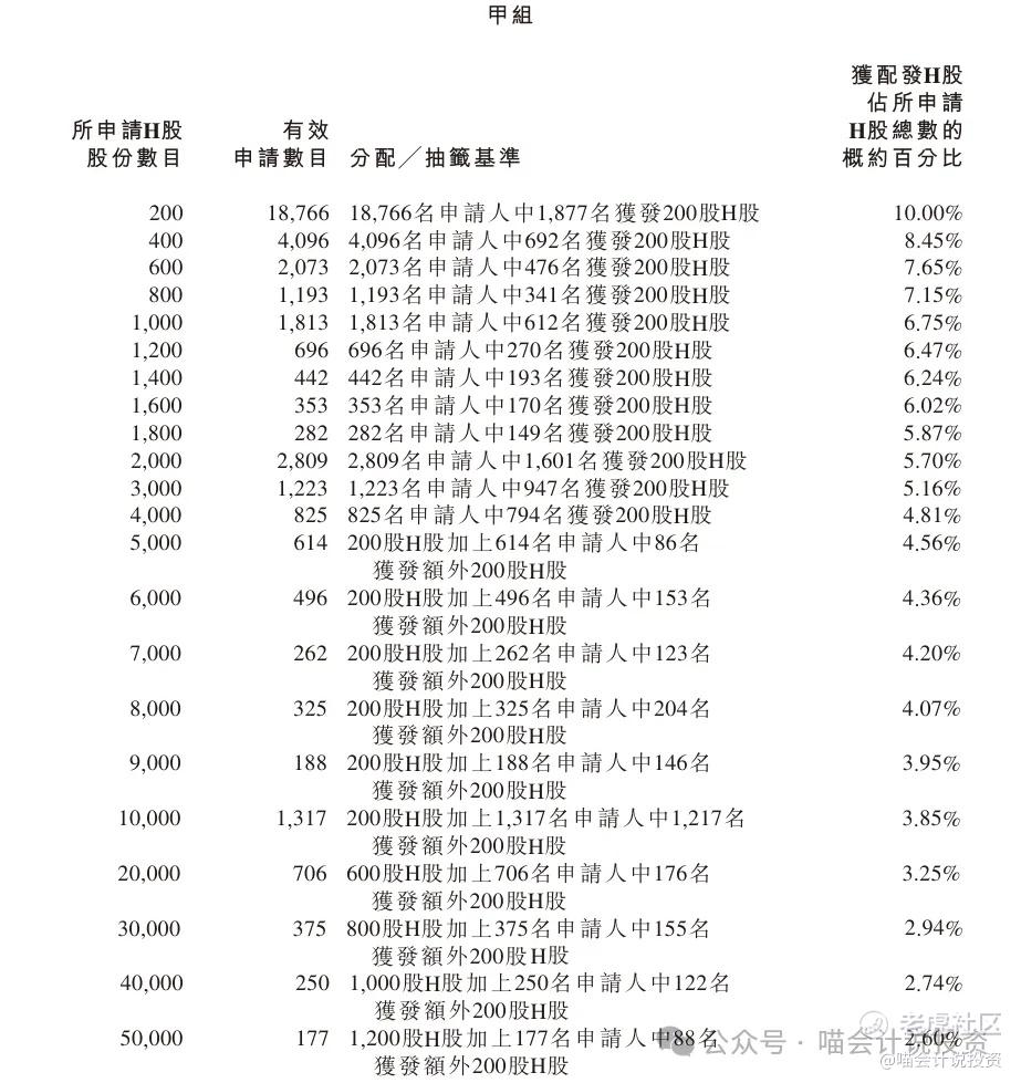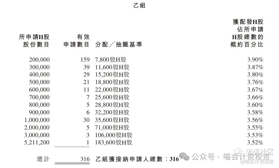 乙组分配:极缓降,乙头单手中签率3.90%,中签率39.00手;