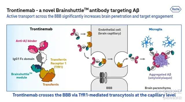 罗氏的Trontinemab利用“脑穿梭技术”,即将Aβ抗体与转铁蛋白受体相结合的蛋白域融合,已经在轻中度AD患者的1b/2a期临床取得了不错的数据,在第12周时接受两种较高剂量(1.8 mg/kg与3.6 mg/kg)治疗的患者大脑淀粉样蛋白水平迅速且显著地降低,且在28周时大部分接受高剂量抗体治疗患者的大脑淀粉样蛋白斑块几乎全部清除。