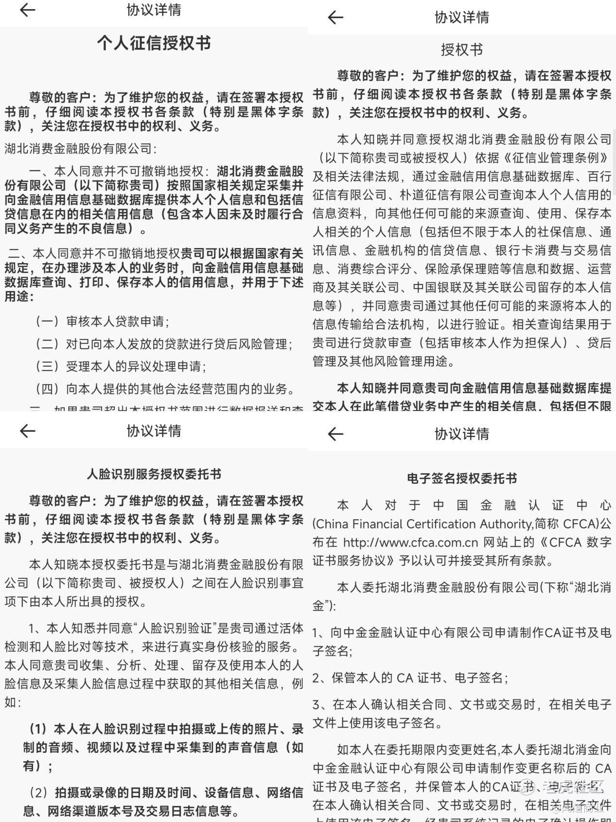 另外,第一份《综合授权书》为借款人向广州数融以及其合作的银行、消金机构、小贷公司申请贷款时签署的综合授权协议,其中还将广州数融小贷及其关联公司百融云创股份有限公司、百融至信(北京)科技有限公司、北京珵数科技有限公司并称为“我们”“榕易有钱”;《数字证书授权使用协议》和另一份《综合授权书》为借款人与陕西长银消金签署的授权协议;《授信相关授权协议》为借款人与哈银消金签署的授权协议。