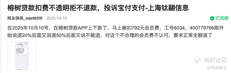 在消费保上,也有一名用户称,“2025年10月10号,在榕树贷款APP上下款了,马上被扣792元会员费,工号6034,刚开始说退20%,后面又说退50%,后面又说不能退,对这个不合理的会员费不认可,要求正常全额退了”。最终这名用户获得退款。