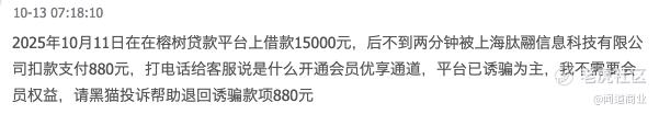 在黑猫投诉上,投诉编号为17388633407的用户表示,“2025年10月11日,在榕树贷款平台上借款15000元,后不到两分钟被上海肽翮信息科技有限公司扣款支付880元,打电话给客服说是什么开通会员优享通道,平台以诱骗为主,我不需要会员权益,请黑猫投诉帮助退回诱骗款项880元。”