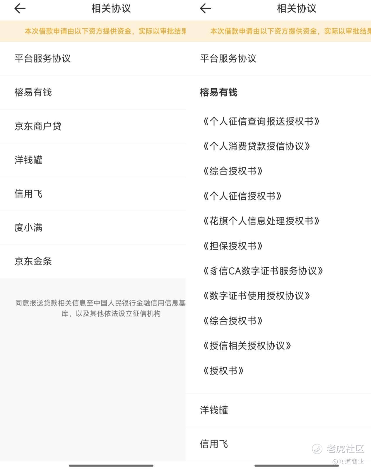 榕树贷款同样存在类似的问题。其合作对象京东金条的《京东金条个人信息查询及使用授权书》显示,京东金融及其合作金融机构为借款人提供消费贷款。点击查看,这些合作的持牌金融机构共96家。但需要指出的是,其中,渤海银行 珠海华润银行、江苏长江商业银行、众邦银行、金城银行、东亚银行、广发银行、桂林银行、华兴银行、莱商银行、蓝海银行、新安银行、新韩银行、新网银行、长安银行、亿联银行、宁波通商银行、晋商消金、华能贵诚、上海银行公布的合作助贷名单中,并没有京东金融的关联公司。