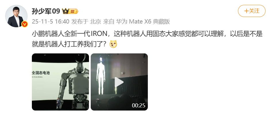 在小鹏机器人发布后的5小时内,媒体讨论焦点仍是该型号机器人的先进性,例如知名汽车博主孙少军就发布微博讨论了该机器人采用的固态电池方案和机器人的应用。