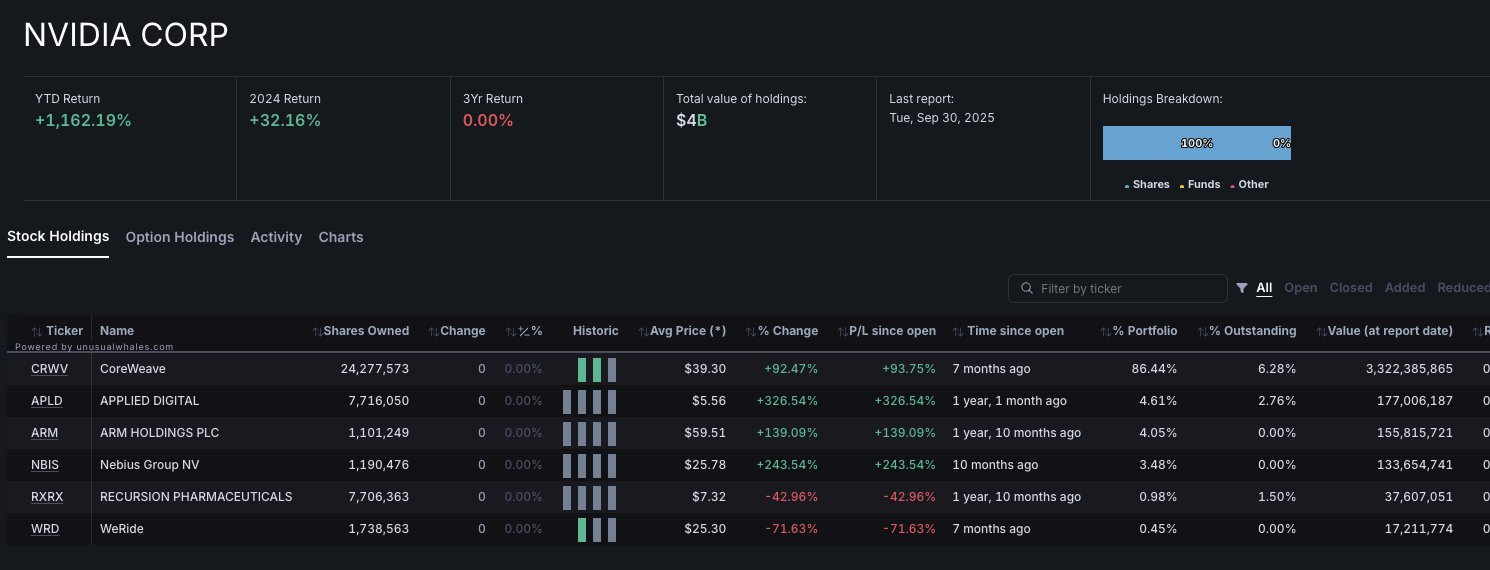 (现在先瞅一眼英伟达更新后的持仓:86%的仓位压在CRWV上面,另外辅助配有 $APPLIED DIGITAL CORP(APLD)$, $ARM Holdings(ARM)$ , $NEBIUS(NBIS)$ ,绝大多数今年收益都很惊人。)